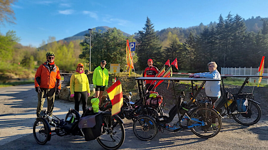 Bien qu’au départ nous ayons été douze inscrits, après de multiples désistements nous n’avons été que cinq à poser nos roues dans ce coin des Pyrénées audoises que nous n’avions pas visité depuis 2019. Nous sommes arrivés là avec la chaleur et le soleil, mais la météo de ce printemps n’a pas daigné nous servir ses bienfaits jusqu’à la fin de notre séjour de quatre jours. Nous avons perdu presque vingt degrés entre le premier et le dernier jour. Nous avons pu néanmoins profiter des superbes paysages, des jolis villages et de l’accueil chaleureux des nouveaux propriétaires du camping de Rennes-les-Bains. Nous avons parcouru 255 km au total avec un dénivelé de 4362 m. Nous n’avons pas eu de problème technique majeur et aucune crevaison. L’ambiance était conviviale comme d’habitude et le bar-restaurant du camping, équipé d’une cheminée, a été fort apprécié, surtout après la baisse de température. Nous sommes repartis avec plein de souvenirs et surtout l’envie de revenir avec une météo plus clémente.