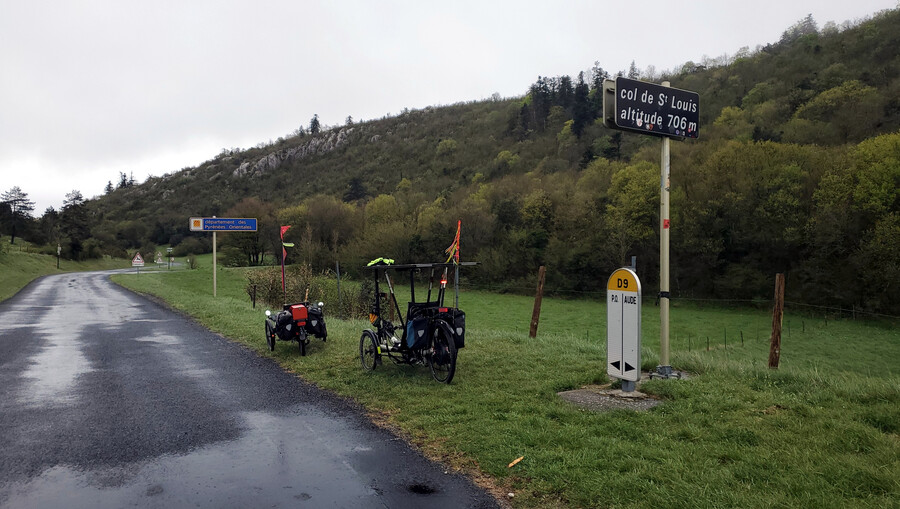 Ce matin, la température a chuté à 7°C et un peu de pluie est annoncée en fin de journée. Un vent froid balaye la vallée de la Sals. Martine, Françoise et André on renoncé à rouler aujourd’hui. Nous partons à deux avec Olivier, bien décidés à rouler aussi vite que possible pour abréger l’aventure et rentrer avant la pluie. Tous les sommets sont dans les nuages. Nous prenons la route de Bugarach. Il n’y a aucun espoir de voir les vautours aujourd’hui. Nous passons devant l’observatoire sans nous arrêter, puis nous traversons Bugarach sans voir le sommet du pech enveloppé de nuages. Nous grimpons de l’autre côté du village puis nous prenons à droite la route de Saint-Louis. Le sommet du pech fait une apparition, entouré d’une couronne de brume. Au fur et à mesure que nous montons, la température baisse. Il ne fera guère que 5°C lorsque nous arriverons à Saint-Louis après une petite descente depuis Parahou. Nous faisons une pause rapide avant de grimper au col de Saint-Louis (706 m). Le col correspond au changement de département. Nous passons dans les Pyrénées orientales.