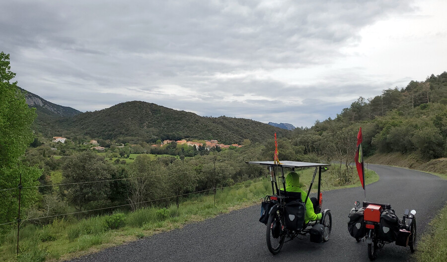 Nous rejoignons la route de Perpignan où il y a peu de circulation en ce dimanche matin. Nous traversons Saint-Paul-de-Fenouillet en prenant à gauche en direction des gorges de Galamus. La montée est balayée par un fort vent du nord qui nous ralentit par rafales. En arrivant en haut nous voyons le Canigou au sommet couvert de neige qui émerge au-dessus des montagnes plus proches. Après quelques photos, nous entrons dans les gorges balayées par le vent. C’est très violent et Olivier doit retenir son vélo à chaque arrêt pour éviter qu’il bascule à cause de son panneau solaire. Les gorges sont magnifiques, même sous ce ciel maussade, avec l’Agly qui cascade au fond. Nous faisons plusieurs arrêts en traversant avant de rejoindre Cubières-sur-Cinoble. Nous nous arrêtons sur la place centrale du village protégée du vent par l’église et les bâtiments autour. On aurait bien aimé qu’un rayon de soleil vienne nous réchauffer, mais aujourd’hui il ne faut pas y compter. Le déjeuner vite avalé, nous reprenons la route qui suit à l’envers le trajet du début du premier jour.