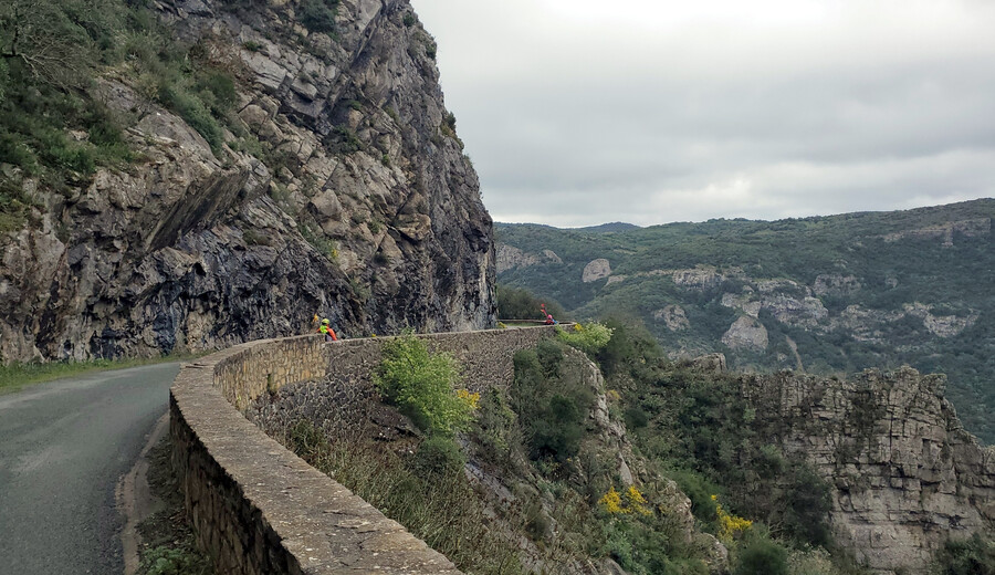 La suite est une belle descente sur une route bien lisse avec des virages amples. Au niveau du château des Maures, dont il ne reste que quelques pierres, la route fait une boucle complète, repassant en-dessous avant de dévaler le ravin dels adoutx. Le revêtement devient un peu plus bosselé et une pancarte annonce une pente moyenne à 10 %. Le paysage est superbe mais notre attention est fortement accaparée par la négociation des virages dans cette forte pente. Nous passons de 600 à 350 m d’altitude en moins de trois kilomètres. Finalement nous arrivons à Caudiès-de-Fenouillèdes où les habitants se terrent chez eux pour éviter le vent glacial qui balaye la vallée de la Boulzane. Nous traversons le village puis nous prenons à gauche la route de Prugnanes. C’est là qu’est prévu le déjeuner, mais nous y arrivons à 11h00. Après quelques photos sur la place où un gamin fait de la trottinette dans la pente, nous continuons la descente jusqu’à Saint-Paul-de-Fenouillet.